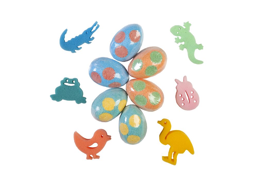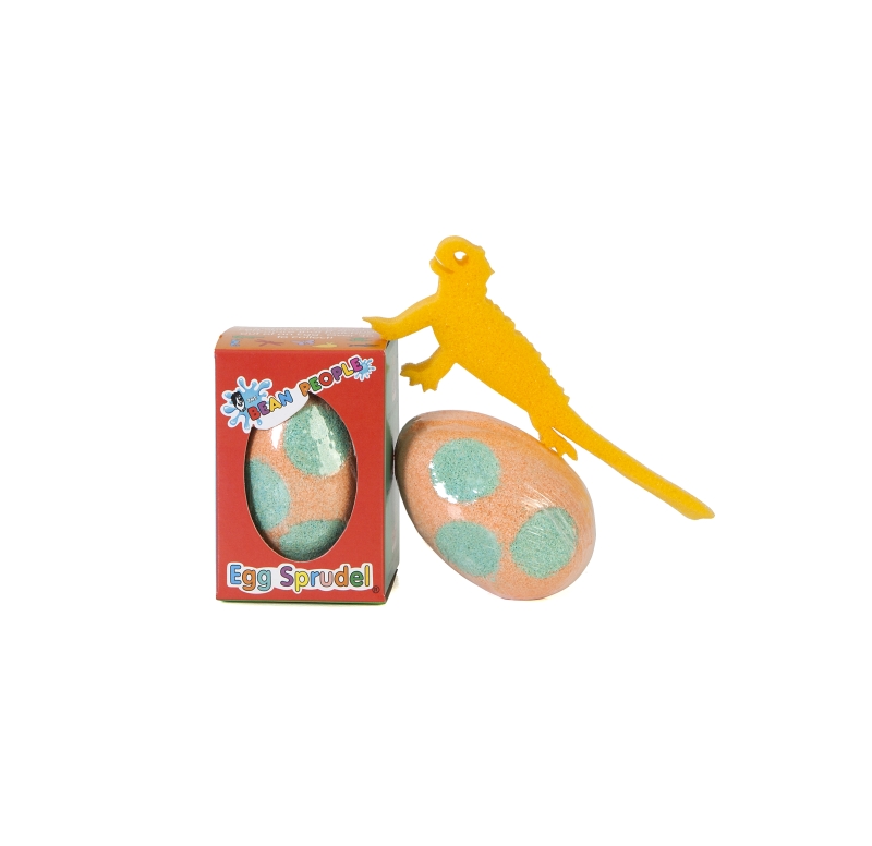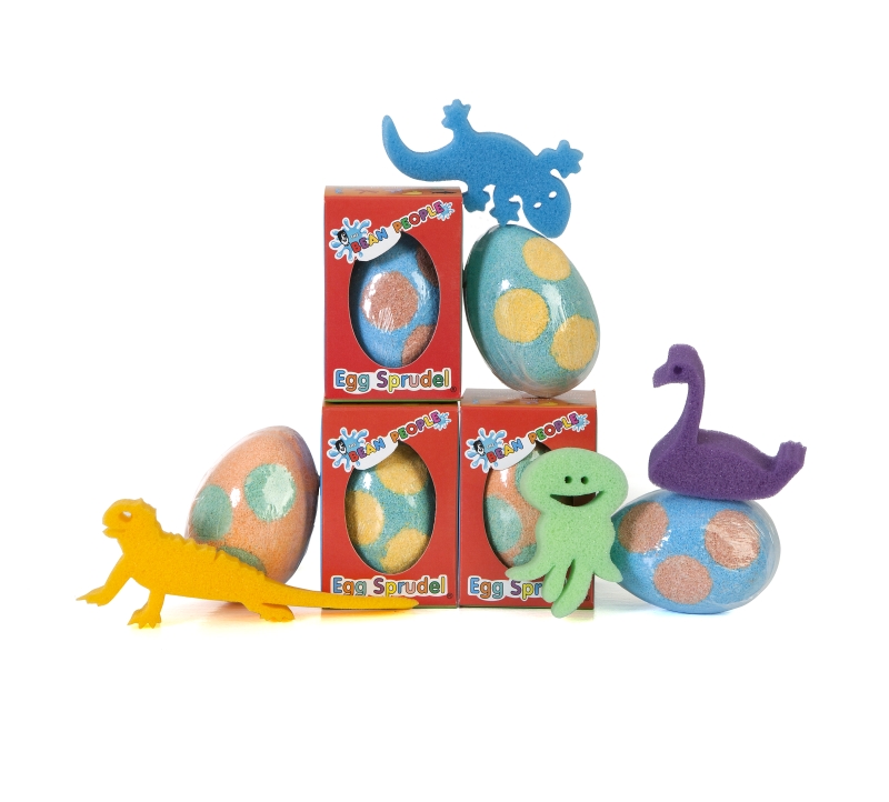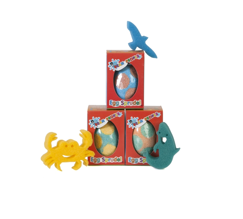 Egg Bath Sprudel Description: The Egg Sprudel comprises of an egg shape – with six differently coloured dots. It fizzes for about a minute, changing the colour of the bathwater, producing foam while simultaneously releasing an aromatic fragrance. The Sprudel also contains a chunky, egg-laying sponge character which magically appears after the fizz. The Egg Sprudels come individually packaged. It is a bath experience designed for children 3 years and above.